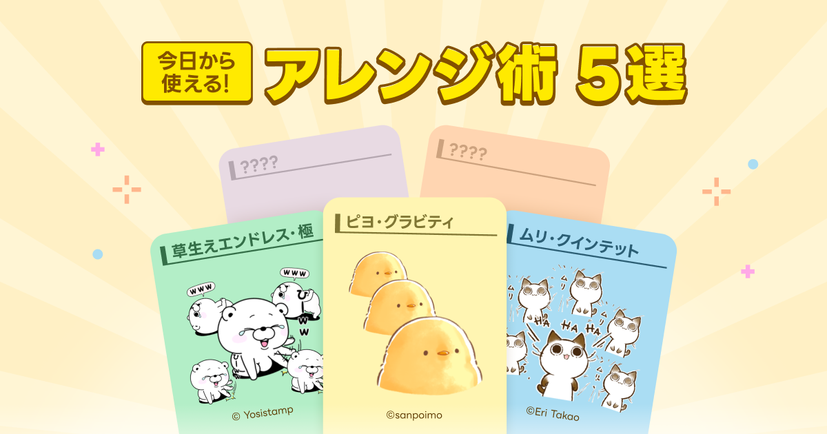 サービス How To記事 2026年03月18日 スタンプって組み合わせられるの!?今日から使えるスタンプアレンジ術 5選 スタンプのサイズや角度を変えたり、自分好みに組み合わせることが出来る『スタンプアレンジ』機能♪今回はそんな表現の幅を広げてくれるアレンジ術をご紹介します。