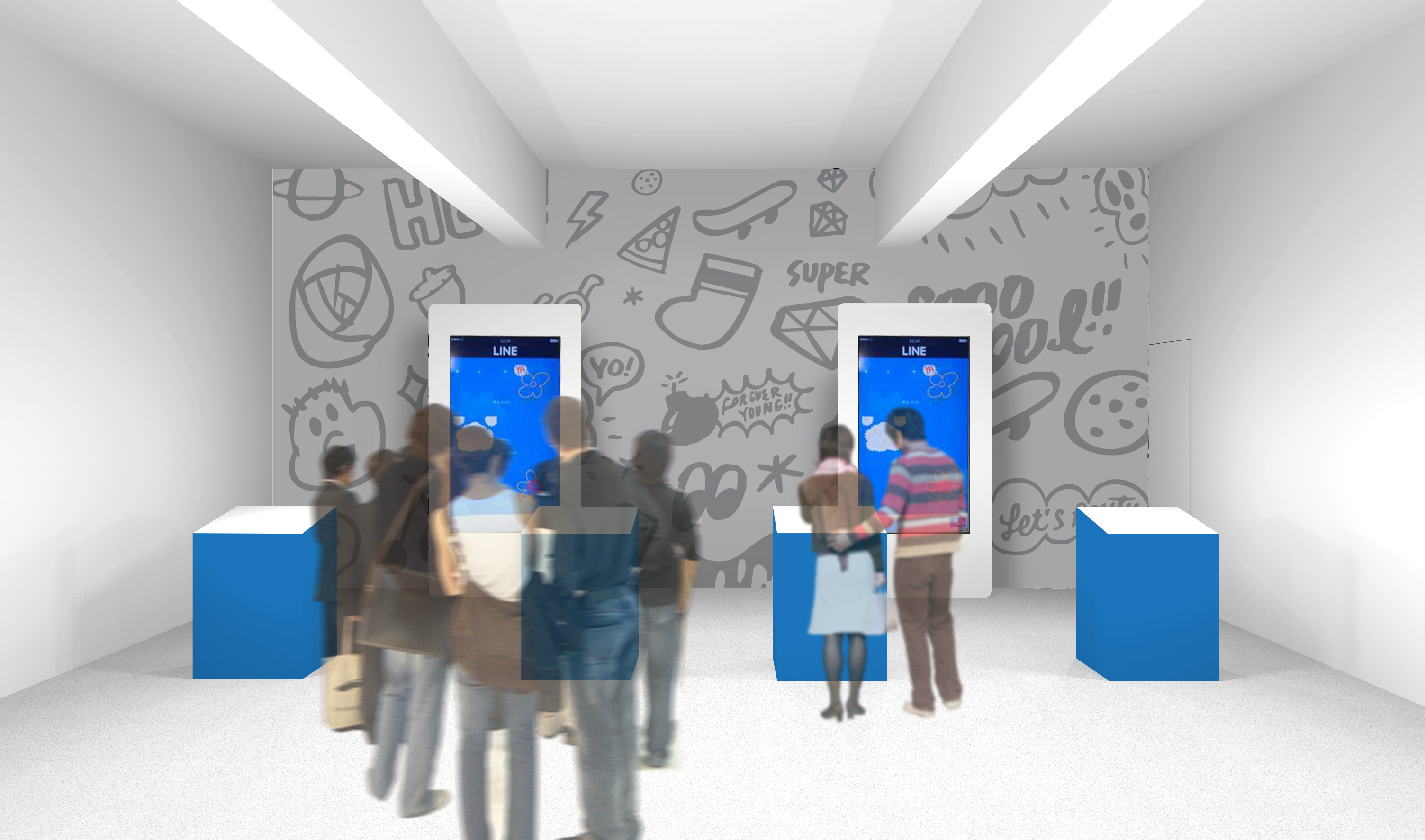 写真手前の4台の端末で、好きなイラストを描き込むと、目の前のLINEトーク画面にスタンプとして映しだされます。スタンプ作りをみんなで気軽に体験できるコーナーです。相手が投稿したスタンプをヒントに自由な発想でスタンプを描いてみてください。こちらは審査不要です!